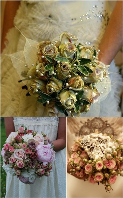 When planning a vintage wedding, the bridal bouquet will be an important detail. Use antique style roses, pearls, feathers, buttons, dark colours like gold, purple, brass..